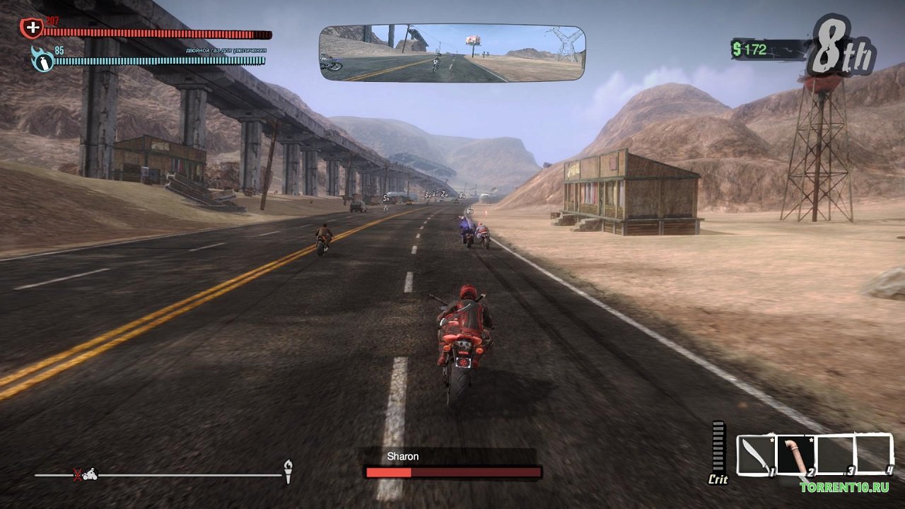 Чтобы получить бонусы, придется подъехать к сопернику как можно ближе и ногой или при помощи оружия сделать так, чтобы он свалился с трассы. В процессе игры можно улучшать свой байк, сменив ему цвет или установив элементы для устрашения соперников.