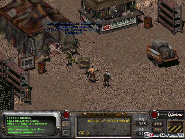 Глядя на эти три типа любой опытный игрок понял, что в Fallout 2 придется выбирать каким способом решать проблемы. Варианта, как правило, три, они соответствуют способностям персонажей. Выбирая героя, подумайте, какой из них вам близок, ведь использовать основную способность гораздо эффективнее, чем остальные.
