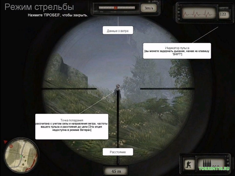 - В игре показана точная имитация снайперской стрельбы, при которой учитывается состояние стрелка - дыхание и концентрация.