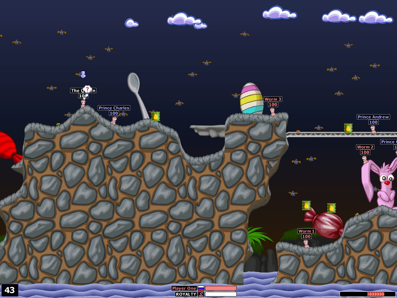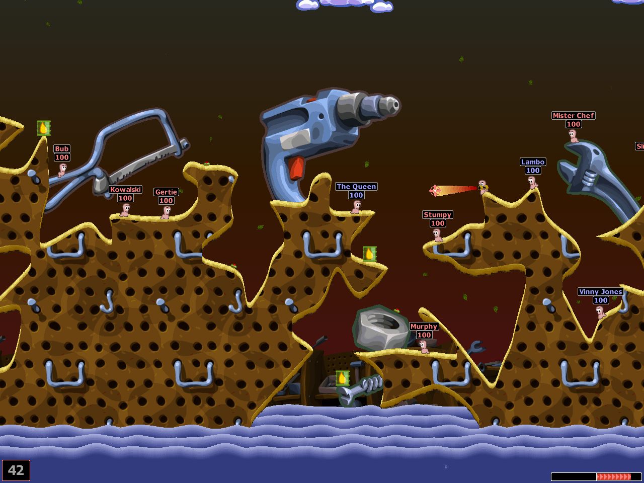 Тут доступны разные режимы, но в основном вам придется играть командно, допустим 5 на 5 бойцов. Игра пошаговая, каждый раз вам дается время на ход, после этого ходит противник, так что важно двигаться быстро, чтобы успеть сделать задуманное. Как правило, сначала вы передвигаете червяка в удобную позицию, а потом выбираете оружие и целитесь, затем стреляете. Ничего сложно тут нет, кроме того, что нужно рассчитывать поправку на ветер, силу и траекторию заброса снаряда, если это граната или миномет, если же вы стреляете автоматом или выбрали УЗИ, то сделайте поправку на разброс и отталкивание. Фишкой игры был еще и разрушаемая карта, например, вместо того, чтобы убивать червяка с удвоенным здоровьем, можно просто вытолкнуть его в воду, чтобы он утонул, но для этого нужно рассчитать траекторию и ударную волну. Если же противник стоит на краю, то в игре есть такой интересный инструмент, как палец, вы просто можете ткнуть червяка, и тот подвинется чуть-чуть в сторону, будет удачно, если там море и он будет тонуть.